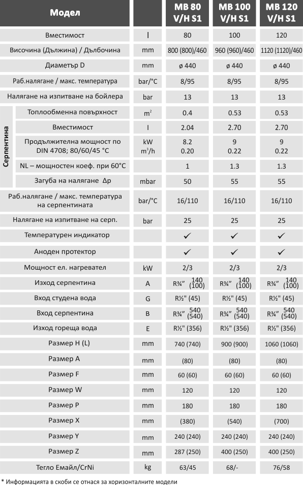 | МОДЕЛ | MB 80 V/H S1 | MB 100 V/H S1 | ||