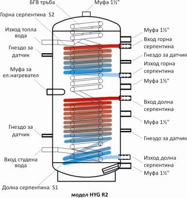 Бойлер с две серпентини Sunsystem 1000л., 7.5kW, за съхранение на хигиенична гореща вода за битови нужди и отопление, емайлиран HYG-R2 1000/33