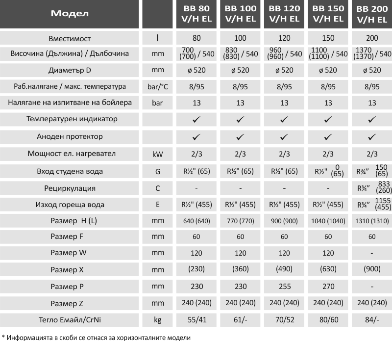 | МОДЕЛ | BB 80 V/H EL | BB 100 V/H EL | BB 120 V/H EL | BB 150 V/H EL | BB 200 V/H EL | |
