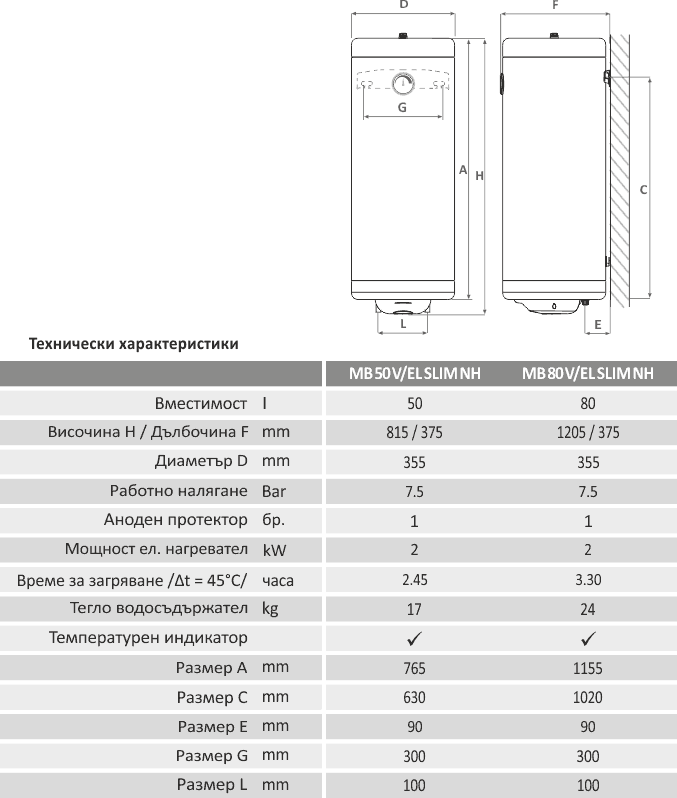 | Вместимост | l | 80 | 100 | 120 | 80 | 100 | 120 |