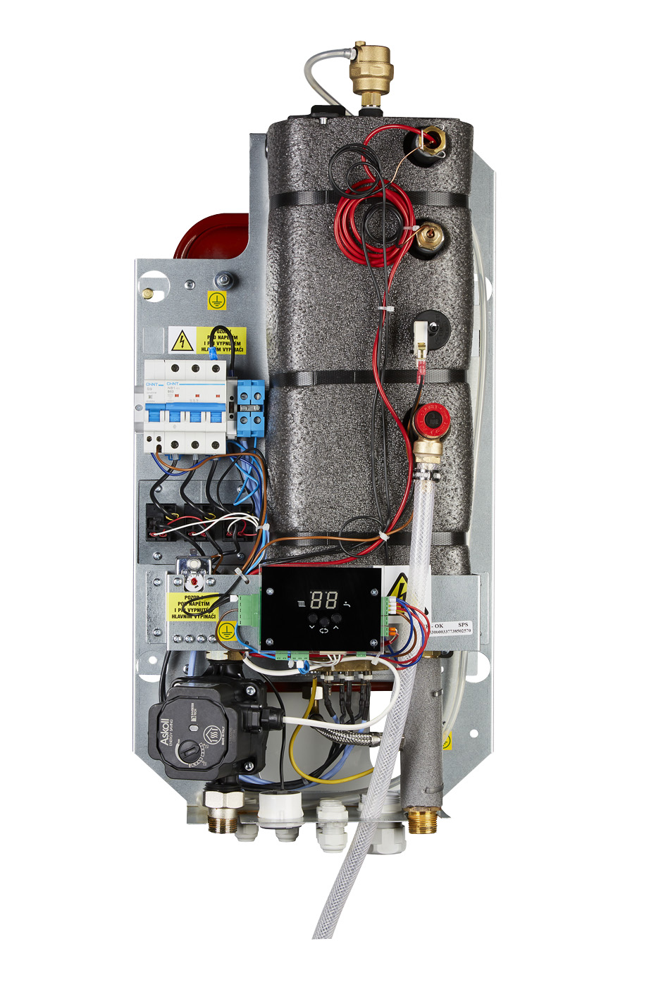 Котелът е оборудвам с всичко необходимо като: циркулационна помпа, разширителен съд с обем 7 литра, предпазен клапан и датчик за налягане.