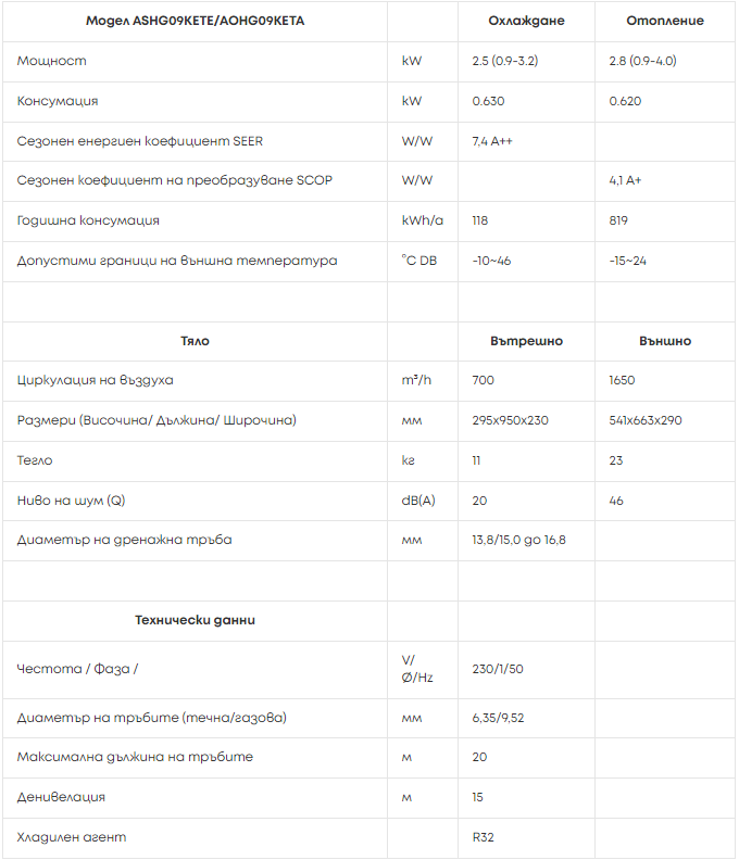 | SEER - сезонна ефективност в режим на охлаждане | 7.40 – клас А ++ |