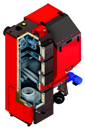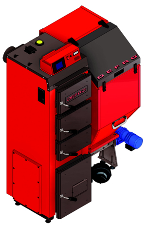 Котел DEFRO DUO е с ретортна горелка, предназначен за отопление на жилищни сгради, обществени и складови помещения с площ от 150-750м2. Котелът е с многоходова конструкция за отвеждане на димните газове. Оборудван е с две горивни камери долна и горна. Топлообменника на котела е изработен от котелна стомана с дебелина 10 мм, а останалите елементи изложени на пламъци са изработени от стомана с дебелина 12 мм . Безопасността на работа при тези котли се осигурява чрез вградени датчици защитаващи котела от прегряване или от спиране на горивният процес.Като допълнение към котела могат да се влючат някой от следните елементи : система за аварийно гасене; стаен термостат SP LUX със сензорен диспей, контролиращ работата на котела; система за сушене на горивото в бункера.