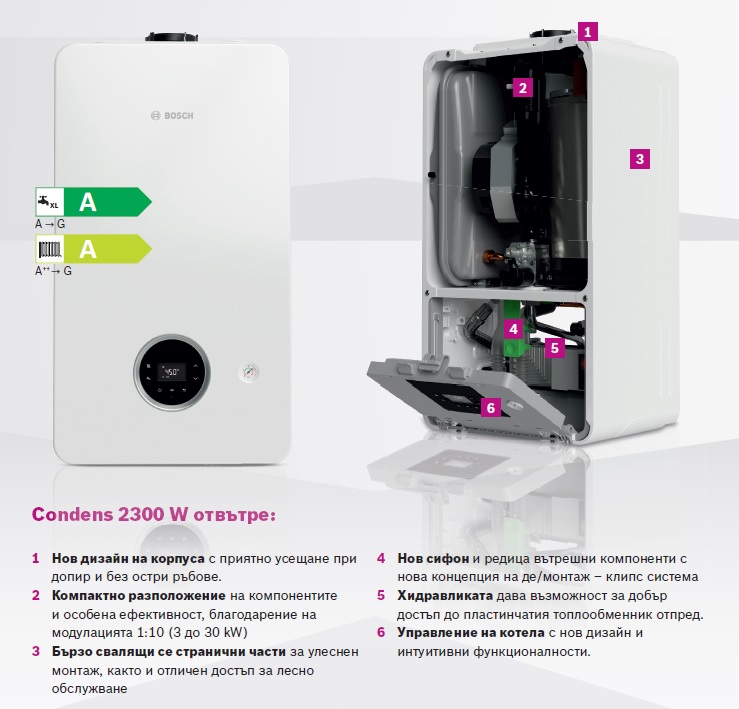 Газов котел Bosch Condens 2300W се класифицира като енергиен клас А. Коефициентът му на ефективност е 94%.