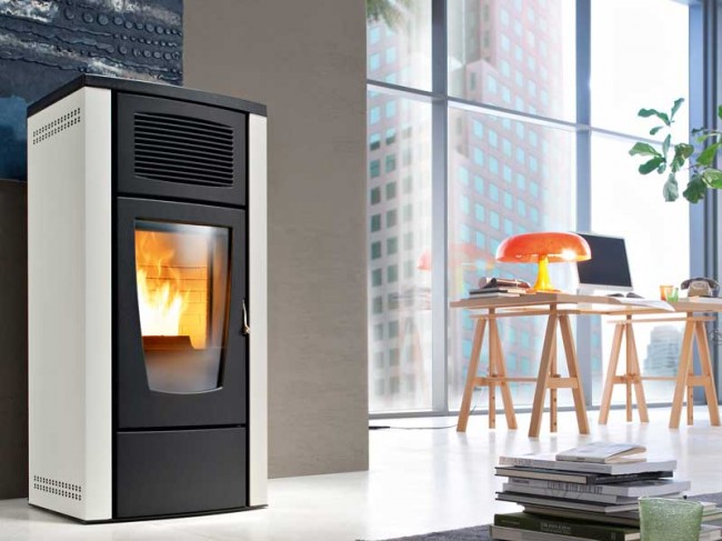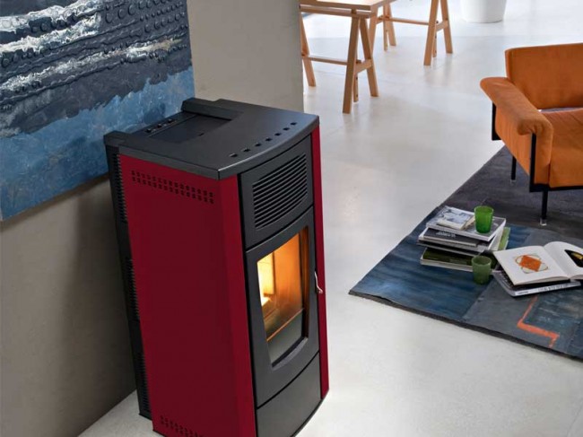 Топловъздушна пелетна камина предназначена за отопление на едно помещение. Предлага се в два цвята – бордо и слонова кост.