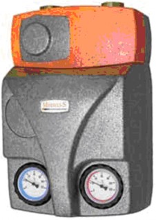 Помпена група за котли на твърдо гориво за средна мощност (дърва, пелети и др.). Позволява свързването към отоплителна система или на буферен акумулиращ съд към топлинен генератор посредством трипътен рециркулационен термичен вентил. Групата повишава температурата на връщащата вода автоматично до температура, по-висока от тази на кондензация. Така защитава котела и въздуходимната система, подобрява производителността на инсталацията и повишава експлоатационния й период.