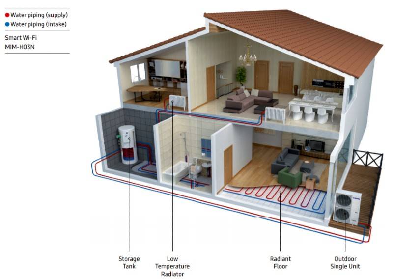 Екологичната система от Samsung за отопление, охлаждане и битова гореща вода на ниска цена. Хладилен агент – R32. Температура на водата в режим на отопление 65°C.